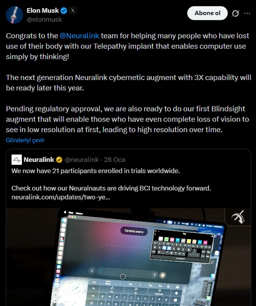 Öte yandan Neuralink, şu anda dünya çapında yürütülen klinik çalışmalarına 21 katılımcının kayıtlı durumda olduğunu duyurdu.