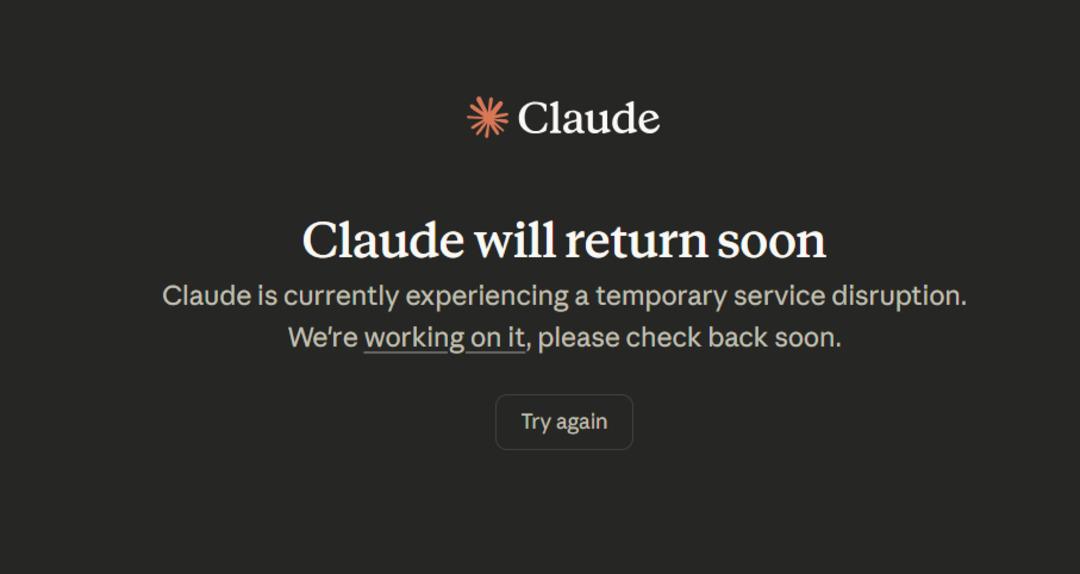 Claude kullanıcıları, yapay zeka aracına giriş yapmak isterken aşağıdaki ekran görüntüsündeki gibi bir ekranla karşılaştıklarını bildiriyor. Ekranda ise “Claude şu anda geçici bir hizmet kesintisi yaşıyor. Sorunu çözmek için çalışıyoruz, lütfen kısa süre sonra tekrar kontrol edin.” yazıyor.