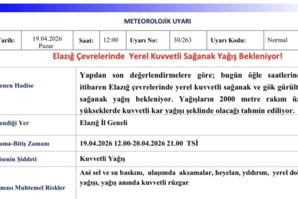 Meteorolojiden Elazığ için yağış uyarısı